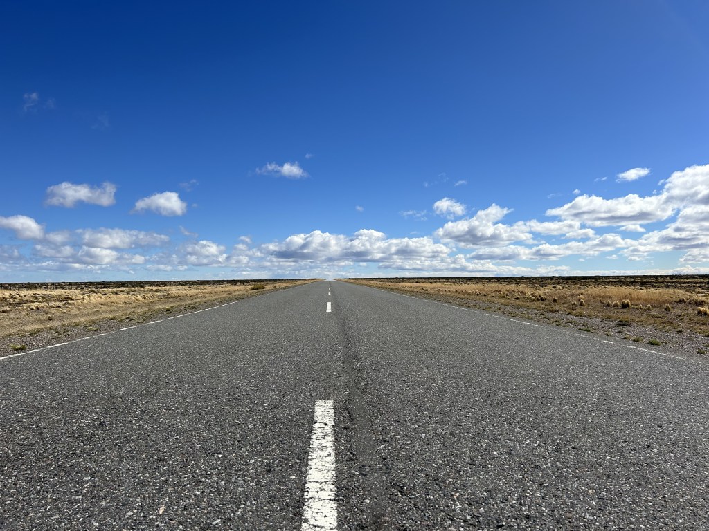 In the vast Patagonian desert, an optical illusion blurs the horizon, merging the sky with the road. You only see the “real” road a few hundred feet ahead. This went on for hours until we finally veered off Route 40, heading toward Los Antiguos.