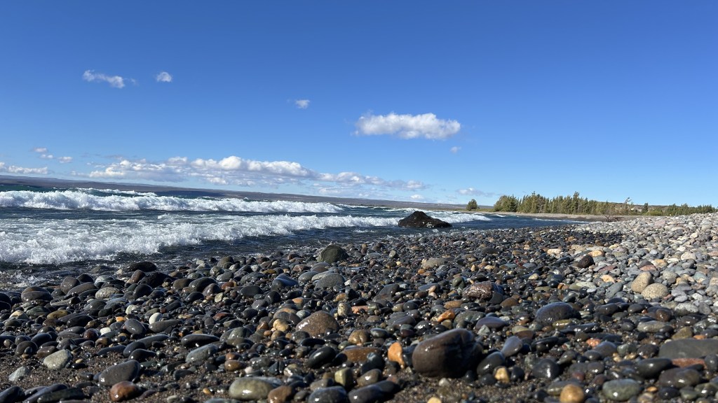 As we turned west, the Chilean mountains began to rise in the distance, showing off their glaciers. Nearing Los Antiguos, we stopped at Lake Buenos Aires—an incredibly vast lake, battered by the relentless wind, sending ocean-like waves crashing onto its shores. It was mesmerizing to stand by a lakeshore and witness waves as if at sea.