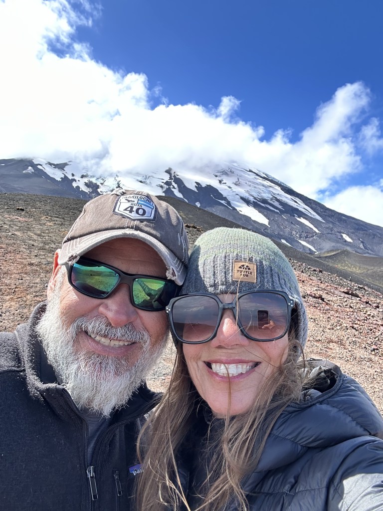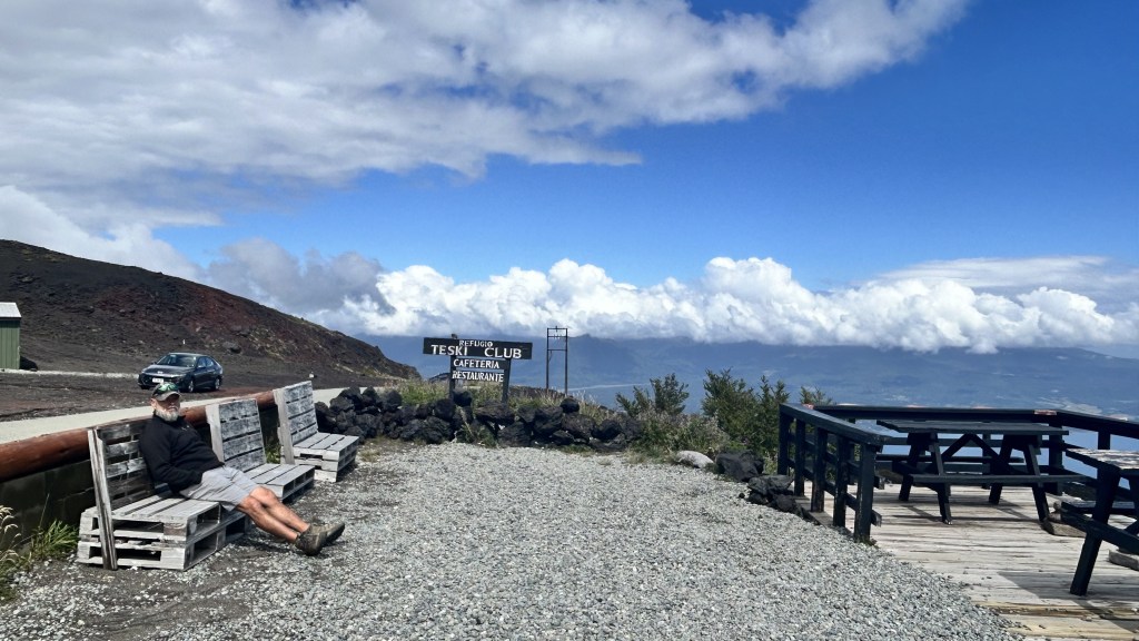 After visiting the park, we drove to Mount Osorno Ski Resort. The drive to the ski lodge was steep but comfortable. From there, we hiked up to see how far we could ascend this dormant volcano. The trail beneath us was even but steep. As we climbed, one false summit after another, strong winds, passing rain, and occasional snowflakes convinced us that today was not the day to reach the top. We descended to Refugio Tesky Club at the base, where we enjoyed a picnic lunch.