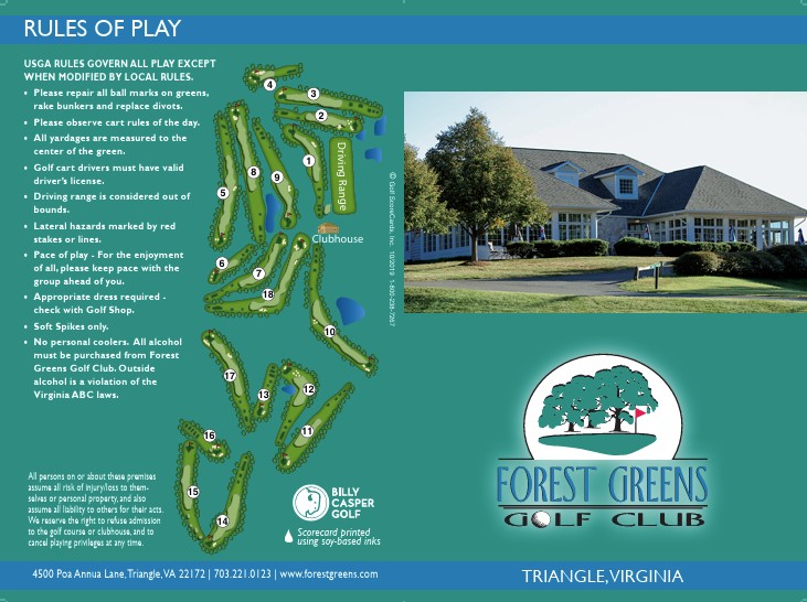 The course is located 34 miles south of Washington, D.C., just a mile west of exit 150B on I-95. The Quantico Marine Corps Base, home of the Marine Corps University, is only 5 miles to the east, and it’s not uncommon to be paired with students or other military personnel stationed there. Forest Greens generously offers discounts to Military members, Veterans, and First Responders.