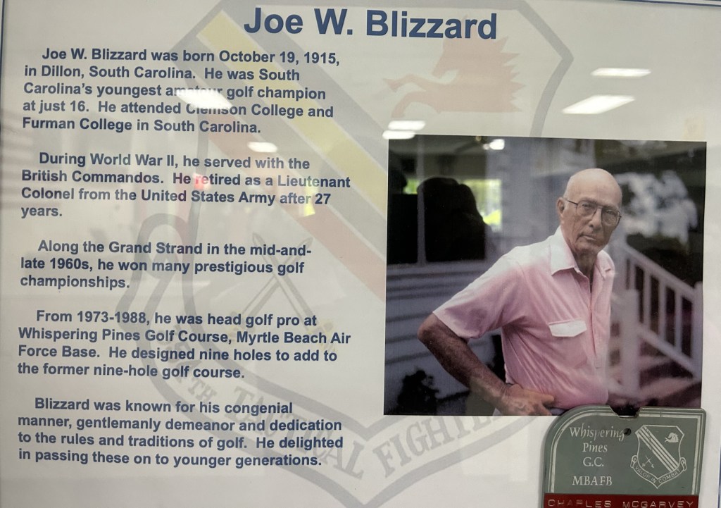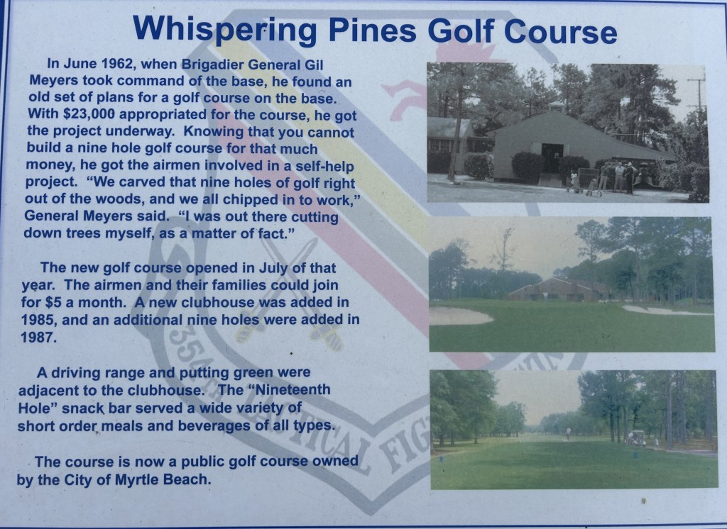 Today, we had the pleasure of playing Whispering Pines Golf Course in Myrtle Beach, South Carolina. Whispering Pines is a golf course rich in history, deeply rooted in military tradition, specifically that of the United States Air Force. The golf course served the Myrtle Beach Air Force Base, established on June 1, 1954, and remained in service until its closure on March 1, 1993. After the base closure, the course was handed over to the city of Myrtle Beach, which has done an incredible job of maintaining its playability and preserving its history. You don’t have to imagine the great heroes who played there; on every hole, plaques display their pictures and a brief history of their service.