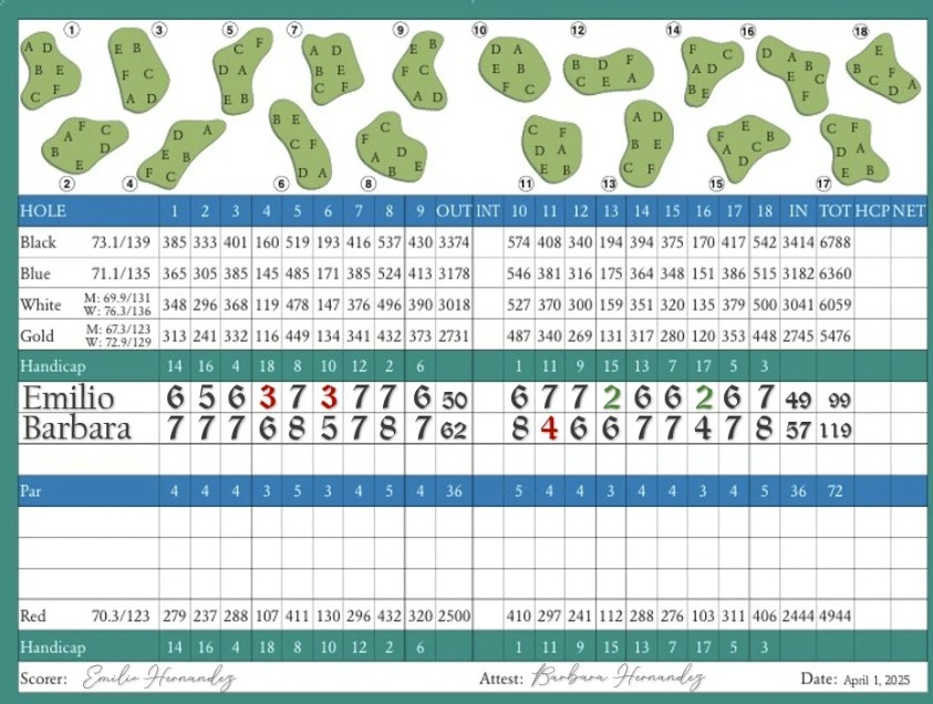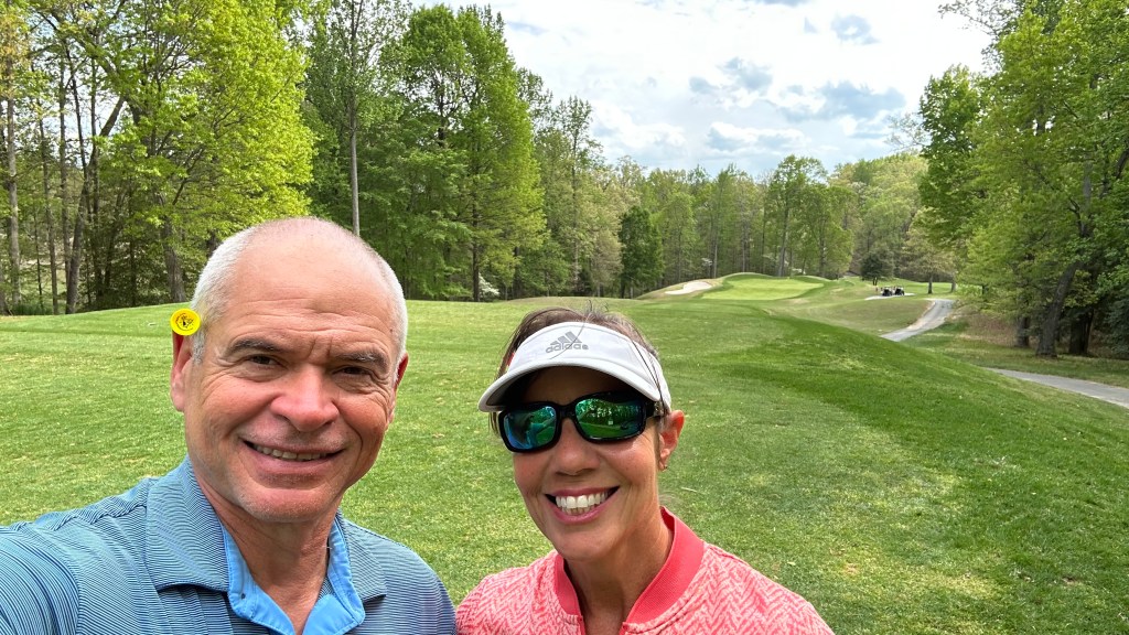 Barbara played incredibly well today, recording her best score ever: 110. She’ll soon be breaking 100, and she’s now regularly beating me when factoring in handicaps. She thoroughly enjoyed the day, basking in the mild sun and perfect 75-degree weather. She even had her fix of nature when a wild turkey wandered close by, seemingly curious about her nearly perfect golf swing.
