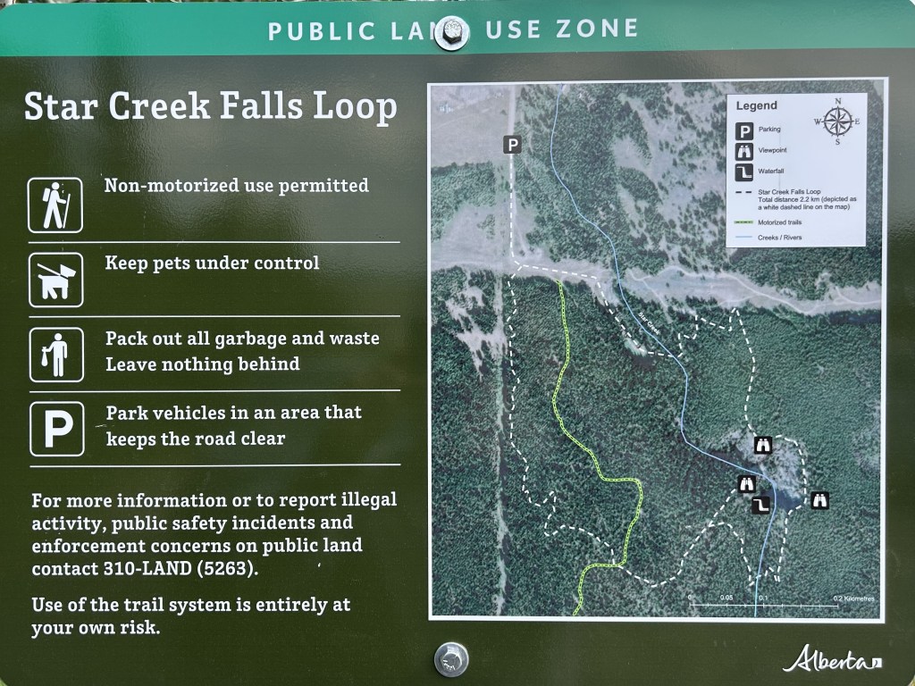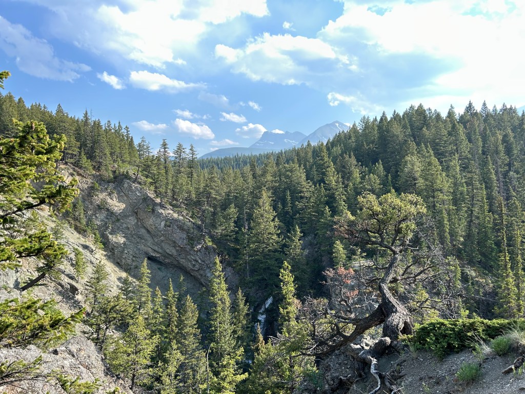 After settling into our Airbnb, it was time for a hike. We decided on something easy: the Star Creek Falls Loop. This 1.8-mile loop through thick young pines provided excellent views of the creek, the waterfall, and the distant Crowsnest Mountain. With only 417 feet of climbing, it wasn’t too difficult and was a great way to stretch our legs after our long car ride.