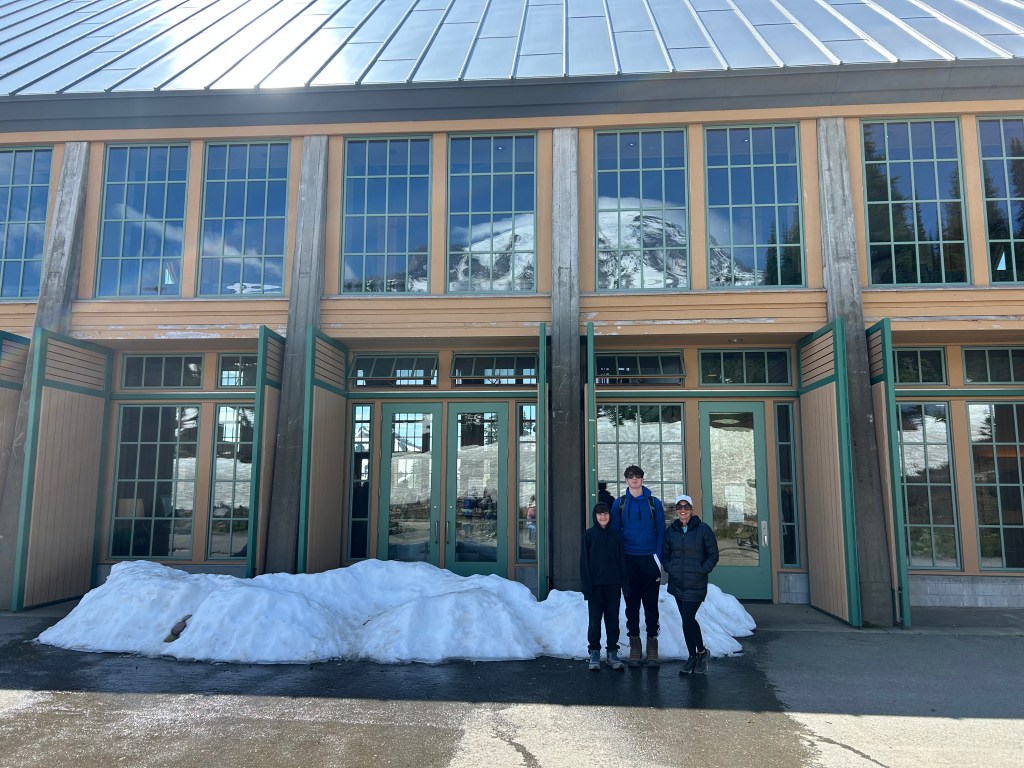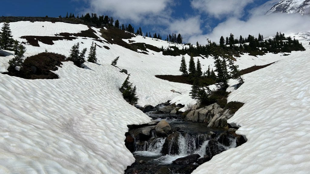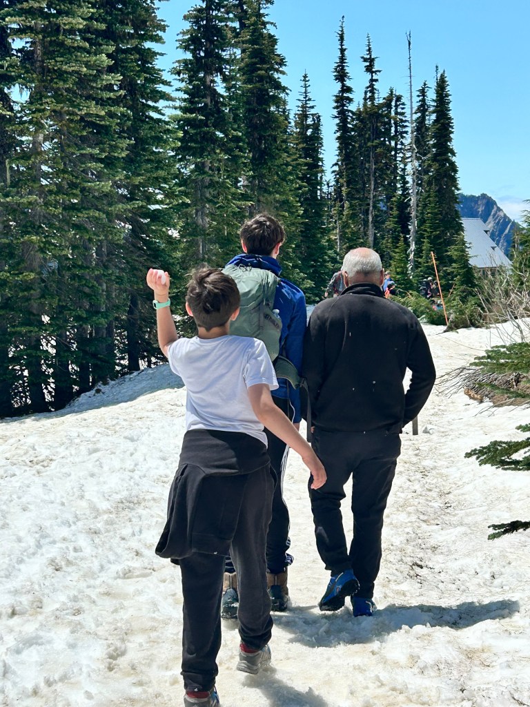 We drove in fully expecting a leisurely hike up the mountain, but what we found when we arrived at the visitor center at the bottom of the mountain was trails fully covered with a couple of feet of snow. What was supposed to be a hike quickly turned into a snowball fight! We hiked the Myrtle Falls trail, a one-mile round trip made difficult by the snow-covered ground.