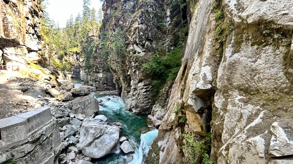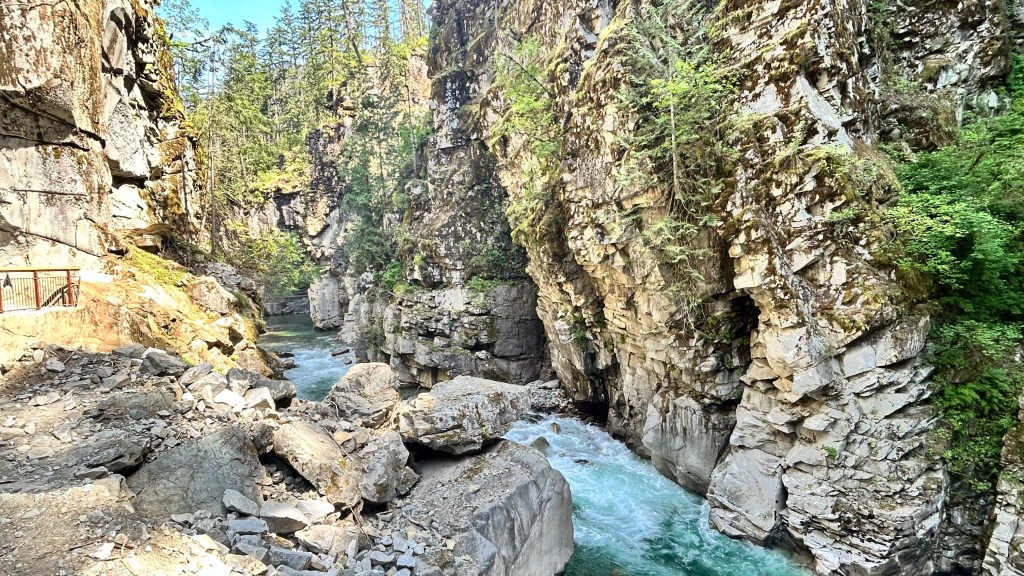 Today we visited the Othello Tunnels at Coquihalla Canyon Park, near Hope, British Columbia. In the early 1900s, the Canadian Pacific Railway decided a route was necessary to link the Kootenay Region with the British Columbia coast by rail. The railway was built over three mountain ranges. In the Coquihalla Gorge, the river cut a 300ft-deep channel of solid granite. A straight line of tunnels was built through it which are known now as the Othello Tunnels.