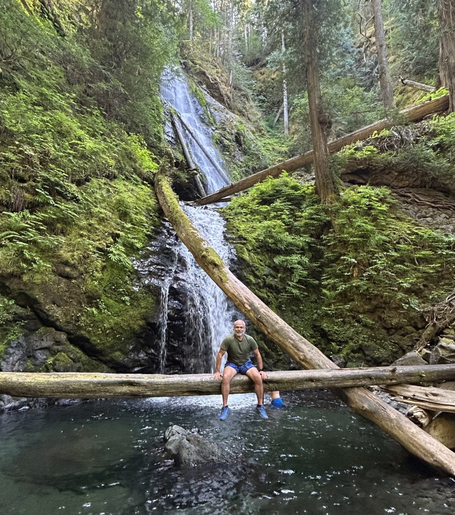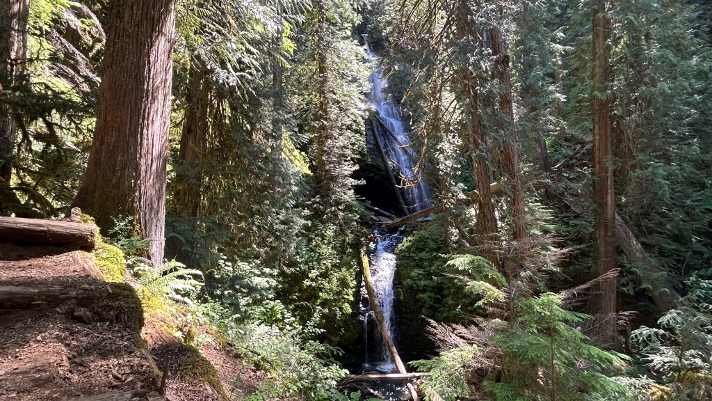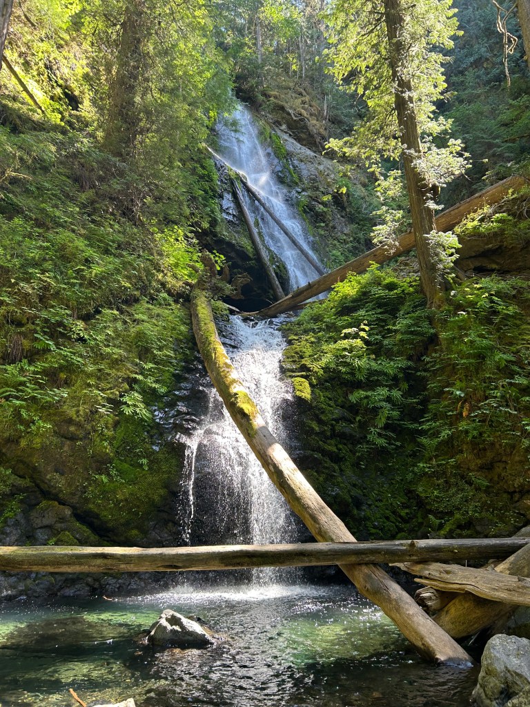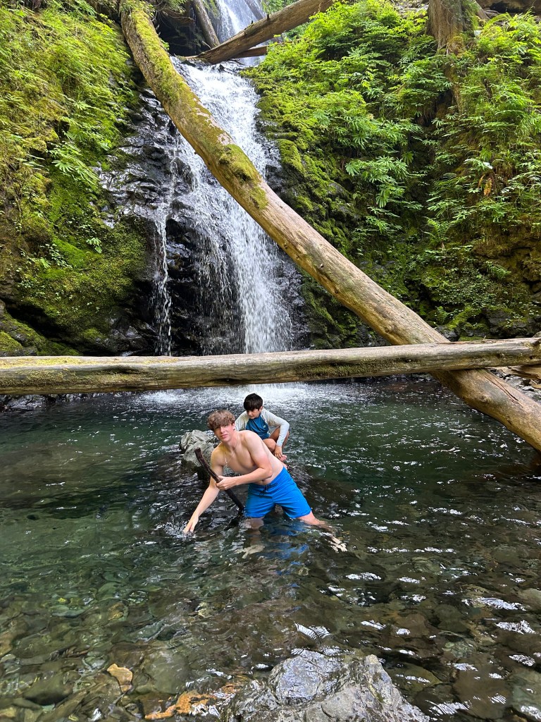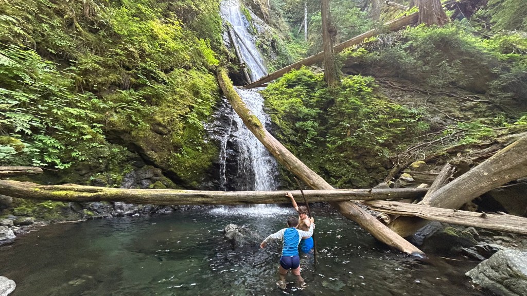 Today we hiked yet another gem in the Olympic National Forest: Murhut Falls. This trail is perfectly maintained, and at only 1.8 miles roundtrip with a 250-foot ascent, it rewards you with one of the most astonishing and accessible waterfalls we’ve ever experienced. The two-tiered, 130-foot waterfall forms an excellent pool at the bottom, perfect for wading and experiencing the force of the water. The well-shaded area at the base is inviting for a lunch picnic, and the boys even went for a swim.
