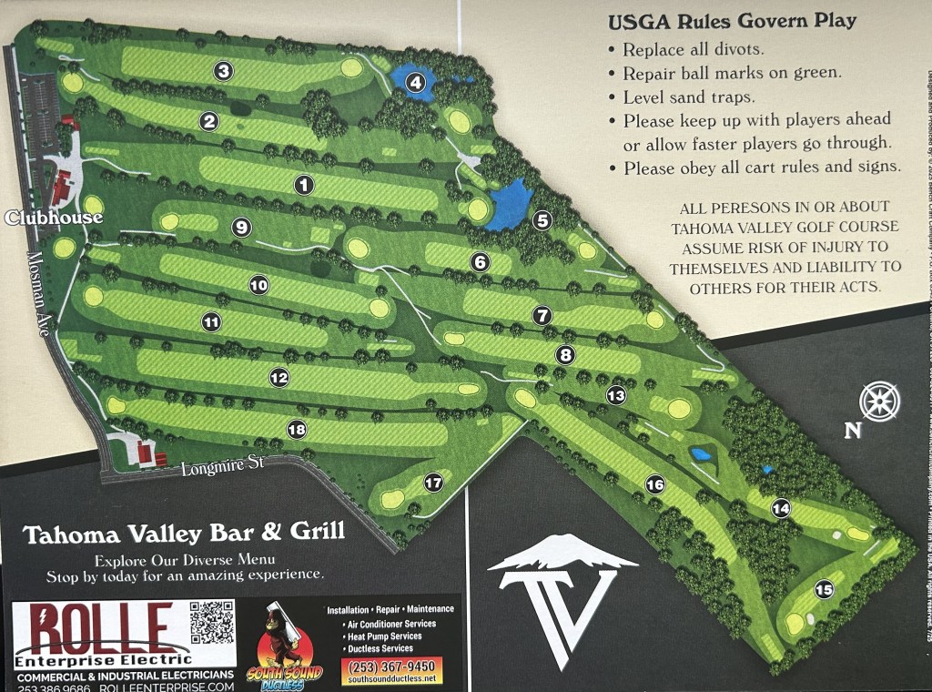 Today we played golf at Tahoma Valley Golf & Country Club, a beautiful course established in 1967. The club is located in Yelm, Washington, a city originally inhabited by the Nisqually Indian Tribe and now home to over ten thousand residents.