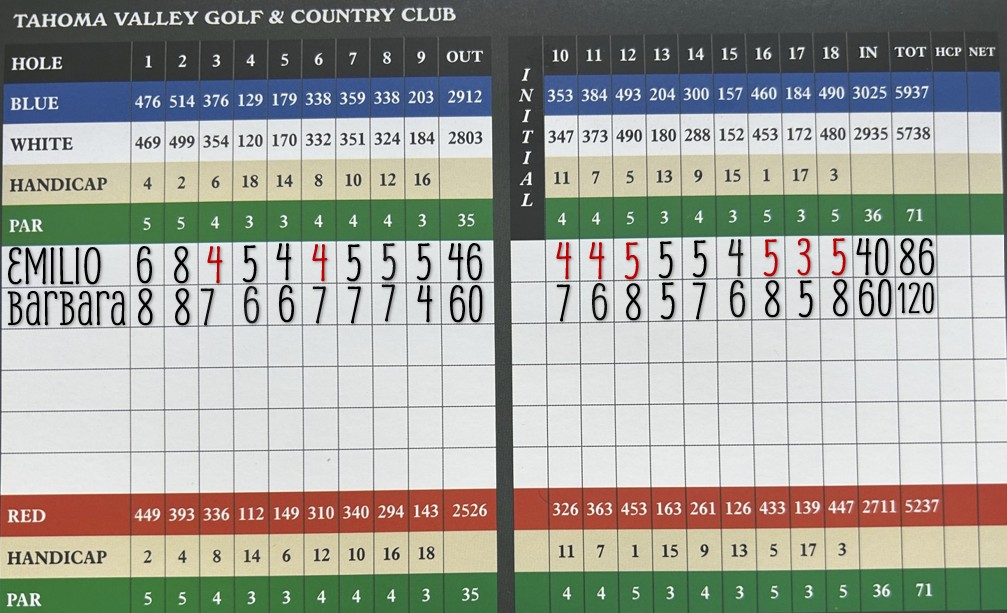 Given the heat wave across the United States, I still can’t believe it was August 4th and I was playing in 61-degree weather! As I’d mentioned previously, Tahoma Valley starts with three challenging holes, but once we got past them, the rest of the course was very enjoyable. In fact, the back nine resulted in the best nine holes of my life, with six pars and a score of 40.