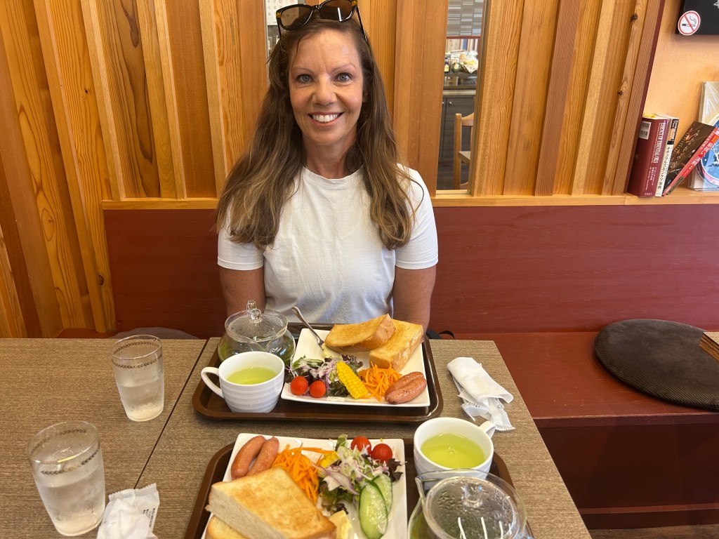 Today, we started our morning with a walking tour of Minakami. Our stroll took us around the town and over the Tone River, where whitewater rafters waved at us. We meandered through the narrow streets, which led us to a small pagoda. Later, we found Kimamaya Café and enjoyed a delicious breakfast of salad greens, sausages, and fresh-baked bread for only $10.