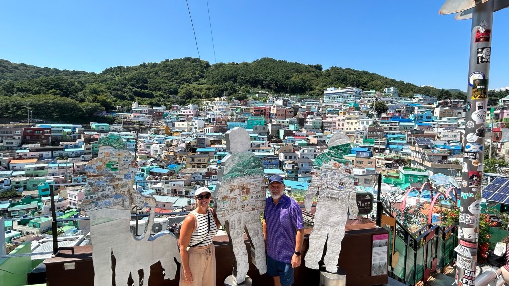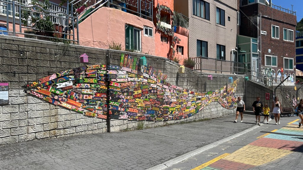 Afterwards, we headed to Gamcheon Culture Village, often referred to as the “Machu Picchu of Busan.” Originally a modest hillside neighborhood built by refugees after the Korean War, it has since been transformed into a colorful, artistic enclave. A government initiative invited artists to revitalize the area with murals, sculptures, and installations, turning it into one of Busan’s most iconic tourist attractions.