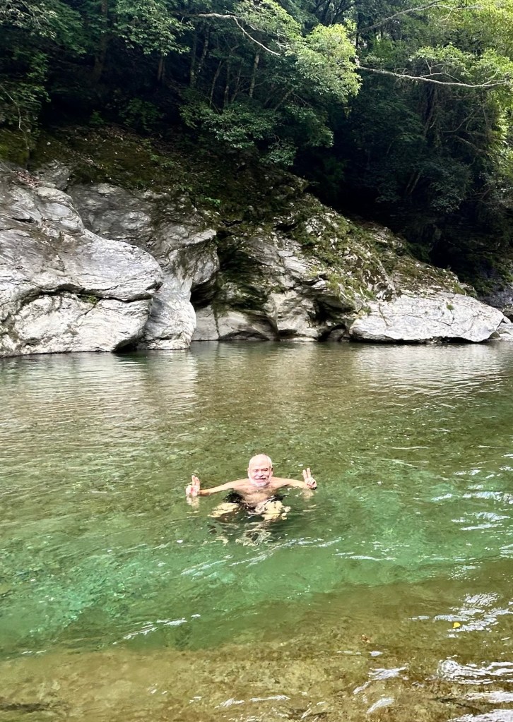 On the other side of the bridge, we continued our short hike, stopping at Biwa Waterfall, a 50-foot cascade named after the Japanese lute (biwa) for its shape. We admired its beauty before heading upstream to the river. There, we changed into swimwear and slipped into the cool waters of the Iya River. For about an hour, we alternated between swimming gently against the current and floating back downstream, letting the flow carry us. The water was perfectly refreshing, a welcome escape from the summer heat.