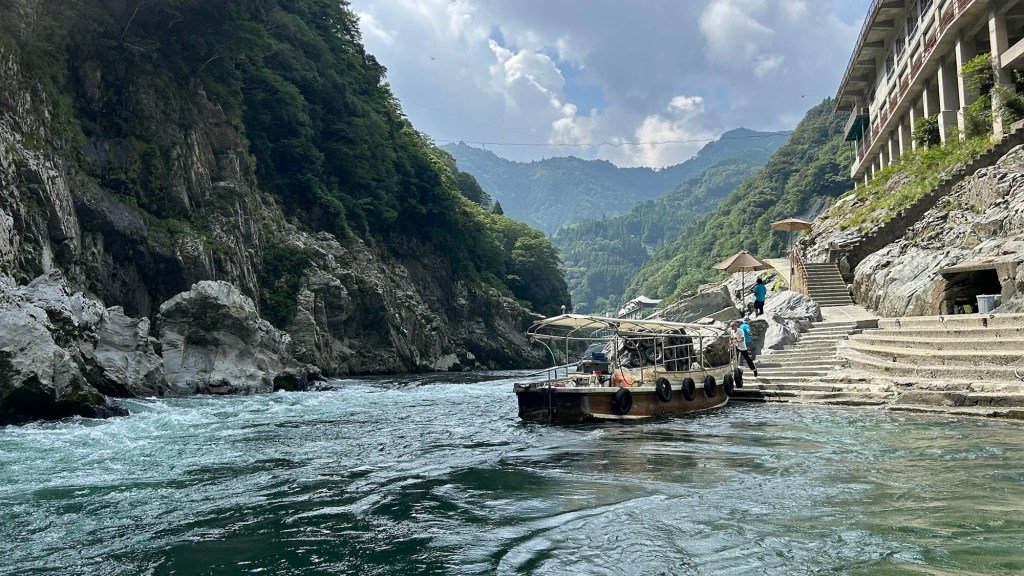Our first stop was at Oboke Gorge, a stunning river canyon carved by the Yoshino River over millions of years. We purchased tickets for a boat tour (about $10 USD each) and descended to the water to board. The ride lasted around 40 minutes, drifting lazily with the current at first before motoring back upstream. From the boat, the beauty of the gorge was indescribable—the emerald-green water was crystal clear, and we even spotted birds of prey swooping down to snatch fish from the surface. Equally impressive was seeing how the narrow mountain road had been carved into the cliffs, supported by tons of concrete and ingenious bridge construction.