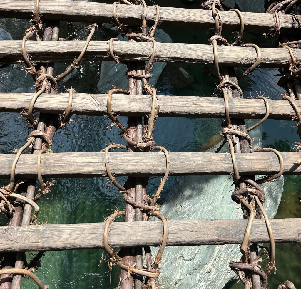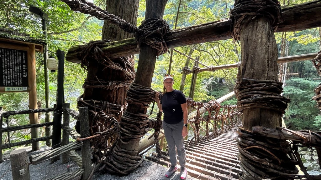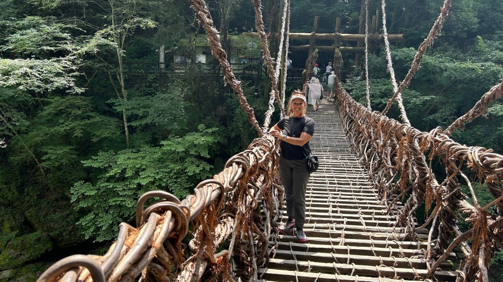 After the boat tour, we drove to Nishiiyayama Village in Miyoshi City to cross the famous Iya Vine Bridge (Kazurabashi). This suspension bridge, once used by samurai to escape pursuers, is woven from mountain vines and stretches about 45 meters across the Iya River, dangling 14 meters above the gorge. It costs 550 yen to cross, and there are no refunds if you lose your nerve halfway! It was both a thrilling experience and a true test of courage, as the widely spaced wooden slats gave us a clear view of the rushing river below.