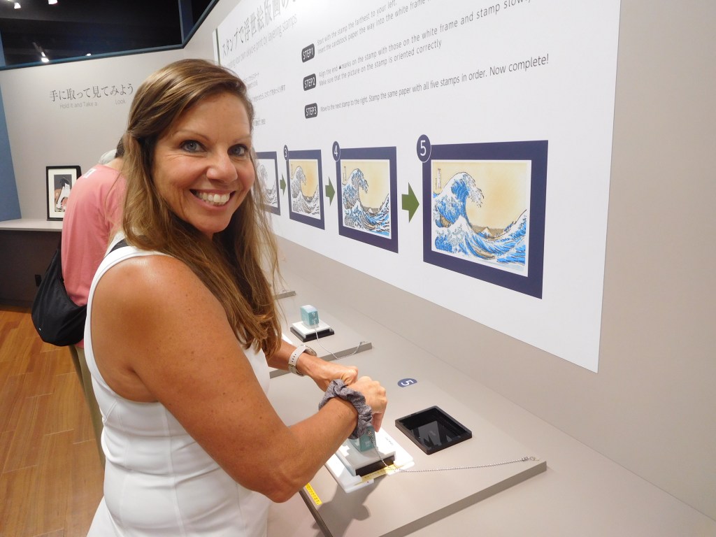 The museum’s collection included a number of pieces from these artists, and we were especially captivated by a video that provided an in-depth explanation of the traditional woodblock printing process. Barbara even try it with beautiful results.
