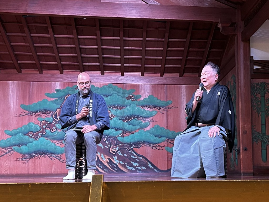 We were not allowed to take pictures during the performance, but afterward, we were treated to a question-and-answer session with the director, Yamamoto-san, who also played the main role. Afterward, we were invited on stage. After putting on the required tabi on our feet, we were allowed to wear the costumes, don the masks, and even play the percussion instruments.