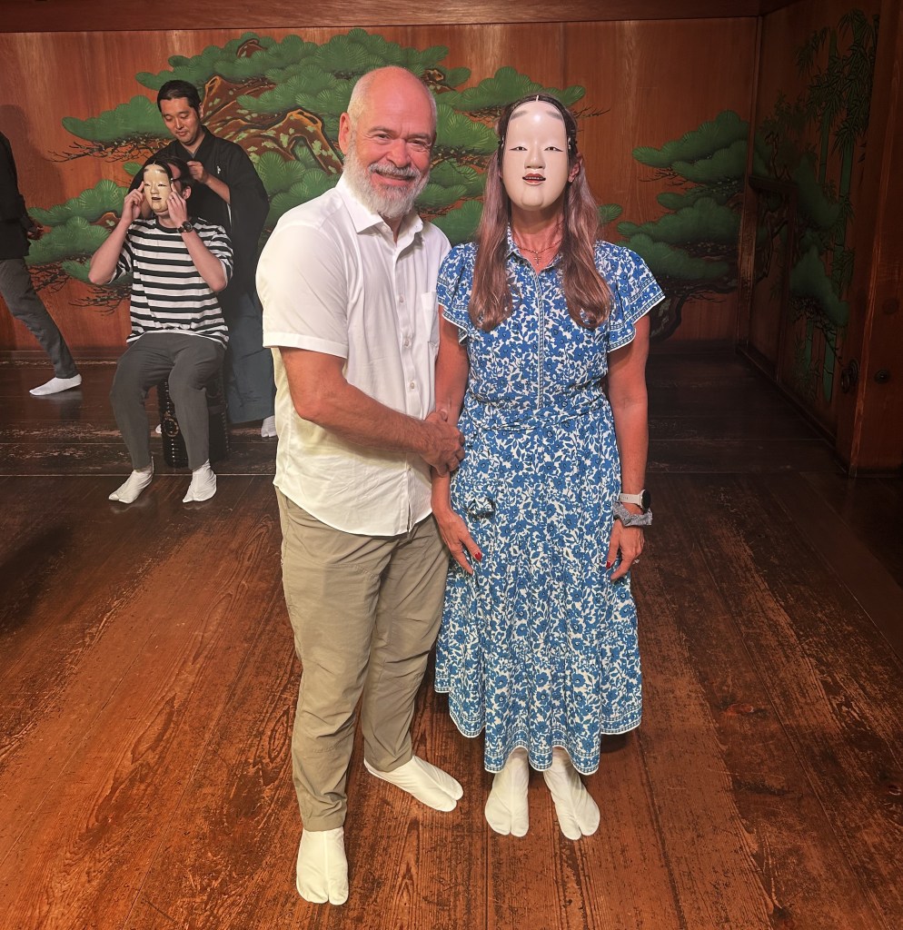 Today we returned to Osaka to attend a Noh theater performance at the Yamamoto Noh Theater. We purposely took the express train this time and noticed it was half the cost of the day before—perhaps due to weekend rates. Noh is a major form of classical Japanese dance-drama that has been performed since the 14th century, making it one of the world’s oldest continuously performed theater arts. It is characterized by its highly stylized and symbolic movements, use of masks and elaborate costumes, and a minimalist stage. Noh dramas often feature a supernatural being, like a ghost or a god, who tells a story through a combination of chant, dance, and music to convey intense emotions such as rage, sorrow, or jealousy.