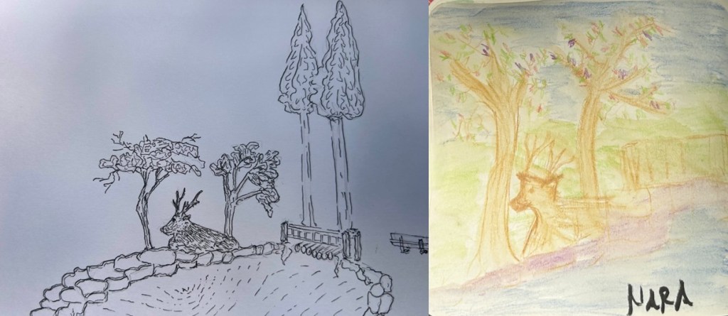Nara Park is a vast public park that encompasses many of Nara’s most famous attractions, including the aforementioned temples and shrines. It’s a beautiful, expansive space with pleasant walking paths, tranquil ponds, and lush greenery that changes with the seasons. We both got to sit and sketch in the park, a very peaceful time. Overall, it was a great experience. Expect large crowds, but there is still enough space to find calm and quiet areas in Nara.