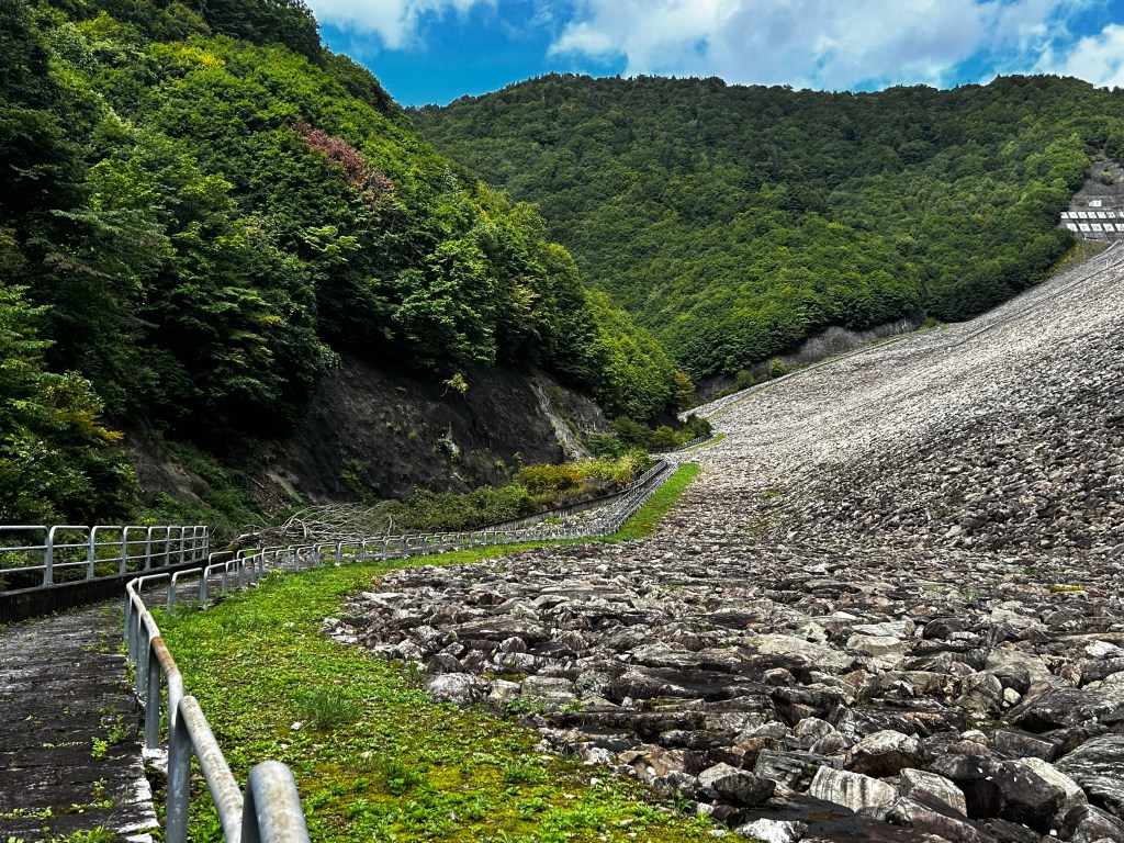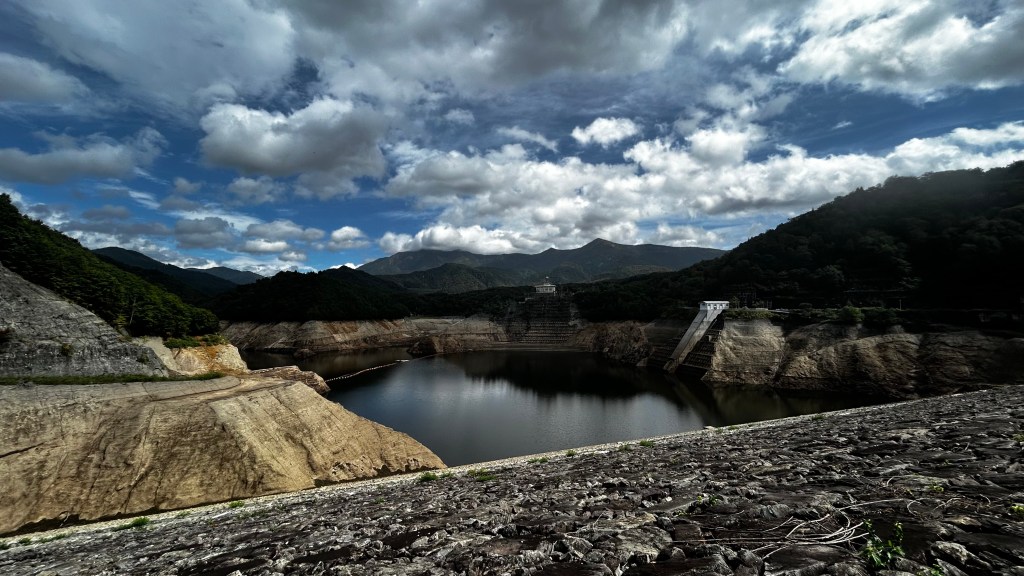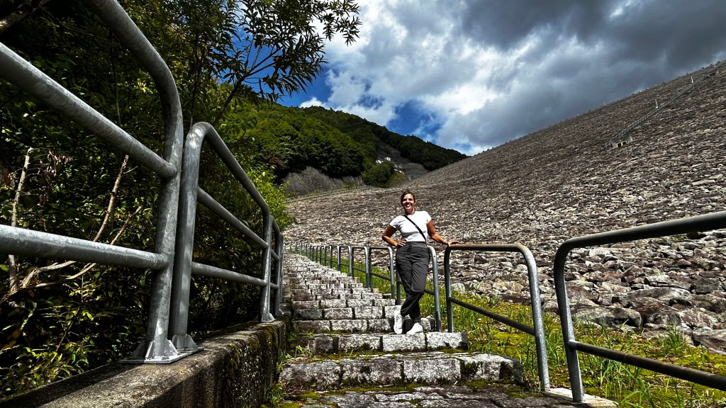 Today we climbed the Naramata Dam. The Naramata Dam is a significant multi-purpose dam located in Minakami Town, Gunma Prefecture, Japan, in the upper part of the Yu no koya area. It is a rock-fill dam with a height of 158 meters (518 ft), making it one of the highest rock-fill dams in Japan. The dam serves a dual function: its primary purpose is flood control, and the second is to provide a much-needed water supply for agriculture and municipal use. As a side benefit, it also supports a 12.2-megawatt hydroelectric power station.