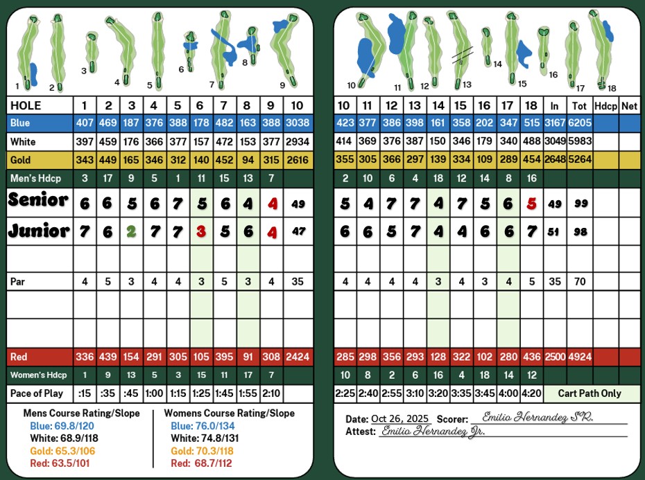 I played consistently poorly but somehow managed to break a hundred. Junior, on the other hand, was an absolute roller coaster—he was either brilliant or horrible. Every single hole, he’d score either a par or a triple bogey, with almost nothing in between. I joked that he was the Mr. Jekyll and Dr. Hyde of golf, adding, “I guess you just like keeping the scorecard honest!”